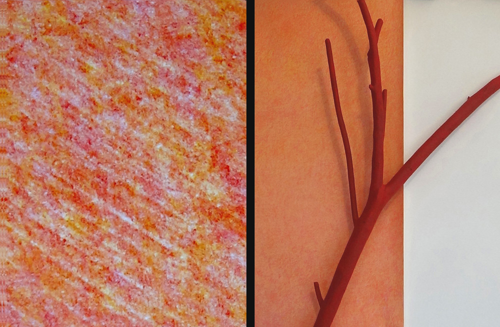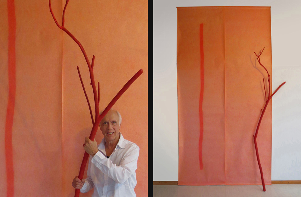 Deux branches d'arbres l'une représentée et l'autre présentée structurent comme une ossature rouge deux longues bandes de papier sur lesquelles une armature rythmique presqu'invisible, à moins d'y porter un regard attentif et précis, additionne de minces instants qui ont tissé au fil du temps une fragile nappe visuelle devenue comme un temps quasi immobile. J'ai travaillé lentement, avec le temps comme premier matériau, l'incarnant dans ces suites d'instants additionnés. Oui, lentement...